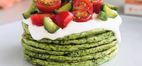 Herby savoury pancakes with lemon yoghurt and balsamic tomato cucumber salad recipe